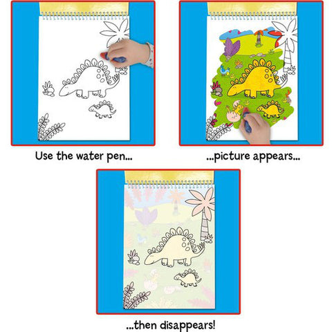 - La contactul cu apa si pe masura ce coloreaza, imaginile ascunse cu dinozauri vor aparea pentru a fi descoperite de cei mici.