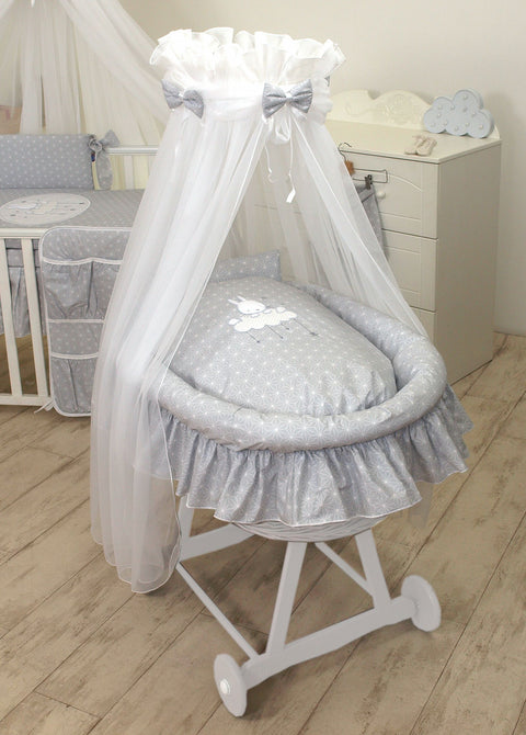 Cos bebe cu suport pe roti, saltea, lenjerie si baldachin, Bear Heart Gri