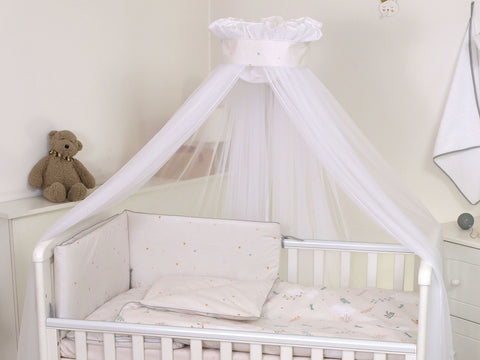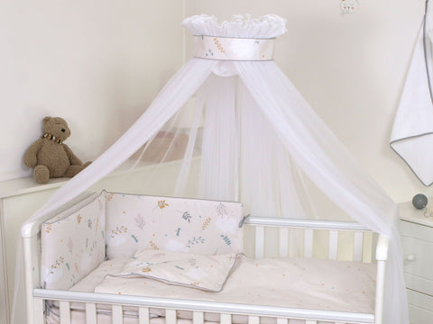 Patutul celui mic este obiectul central care atrage atentia in incapere. In aceste conditii, un baldachin se dovedeste deopotriva util si frumos. Din punct de vedere practic, baldachinul protejeaza copilul impotriva insectelor. Mai tarziu, baldachinul va fi apreciat pentru aspectul sau estetic si pentru ca ii ofera copilului un spatiu personal in care se poate retrage, un coltisor numai al sau. Baldachinul este realizat din tul, ale carui ochiuri mici permit o buna ventilare a aerului, ferind totodata bebelusul de insecte. Baldachinul are o latime de 160 cm si o lungime de 600 cm, care confera o acoperire completa a oricarui model de patut pentru bebelus. Tulul permite, pe langa buna circulatie a aerului, si patrunderea luminii, atat de necesara pentru o crestere si dezvoltare sanatoase si pentru reglarea ritmului circadian al micutului. Foarte frumos impodobit in partea de sus cu inima generoasa aplicata si banda pe marginile verticale ii ofera baldachinului un aspect unic, princiar, care il face unic in randul produselor de acest tip. Poate fi pozitionat atat pe capatul de pat cat si pe laterala patului. Mai mult decat atat, materialele textile utilizate in fabricarea produsului dispun de avizul pozitiv al HZ. C 00521 10 NH si de certificatul de calitate al Oeko-Tex Standard 100, care garanteaza faptul ca acesta indeplineste criteriile de calitate necesare unui produs pentru copii. Broderia unitara care se regaseste pe toate piesele acestui set ii confera un aspect extrem de ingrijit, elegant si sofisticat. Intretinerea baldachinului este de asemenea usoara, caci el se poate spala la masina de spalat rufe, la temperatura joasa. Dimensiune: Lungime 600 cm, Inaltime 160 cm. Material: 100% tul, 100% bumbac - decoratiune. Produsele Amy sunt durabile si nu isi pierd forma sau culoarea dupa perioade lungi de utilizare si spalare. Patul si lenjeria prezentate in poza nu sunt incluse.