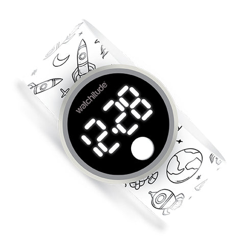 Descoperiti ceasul digital pentru copii model rachete, un accesoriu care transforma timpul intr-o aventura! Acest ceas nu este doar un instrument de masurare a timpului, ci si o modalitate distractiva de a exprima creativitatea. Cu o bratara din silicon moale, de tip slap-on, ceasul este usor de purtat si se poate ajusta pentru a se potrivi perfect pe mana celor mici. Bratara este lavabila si poate fi recolorata de cate ori doriti, oferind astfel o experienta personalizata si distractiva.