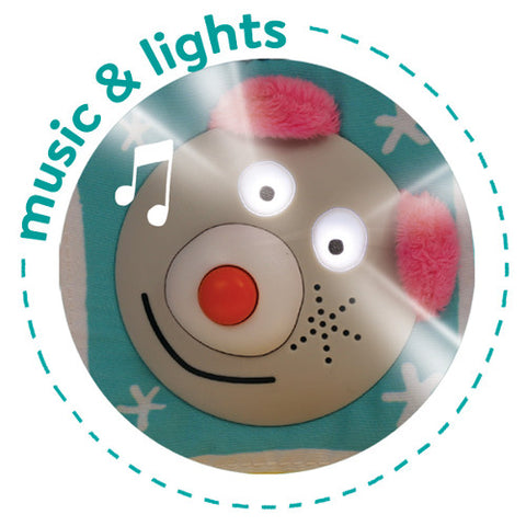 - Carticica magica este dotata cu 8 casute de activitate: sfera cu bilute, ursulet luminos si muzical, iepuras si puisor plimbareti care se ascund in buzunarele, pisicuta cu anouri, soricelul si cascavalul lui, oglinda educativa si floricica fosnitoare.