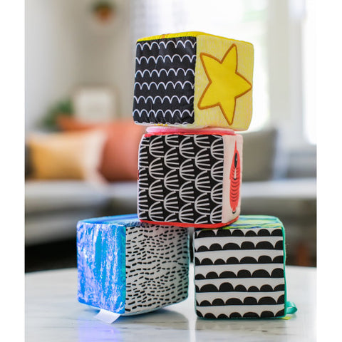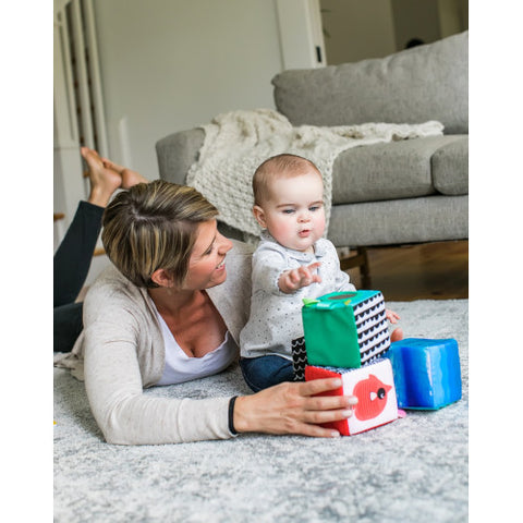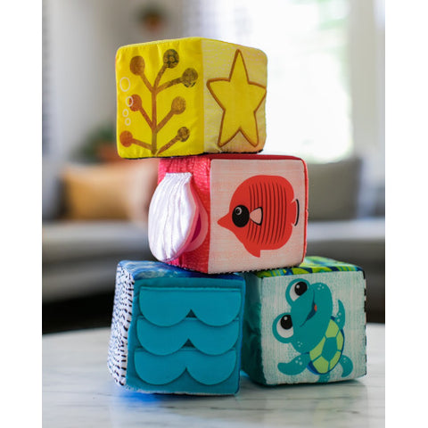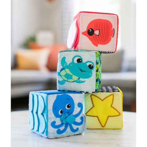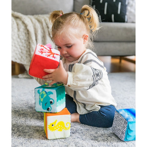 Cuburile moi Explore & Discover sunt facute ca manutele mici ale bebelusilor sa le poata strange, cladi sau rostogoli. Fiecare cub colorat este un instrument de descoperire, si ofera activitati multi-senzoriale de care bebelusul tau va fi incantat! Descopera oglinda sigura pentru bebelusi ascunsa sub soare. Porneste intr-un safari alaturi de cubul cu animale salbatice si invata numele animalelor in Engleza, Franceza sau Spaniola. Aceste cuburi moi sunt create sa il distreze pe bebelus, designul moale il transforma in activitatea perfecta intr-un loc linistit.