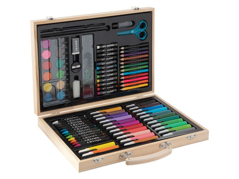 Cutie din lemn cu accesorii pentru desen si pictura, 86 piese