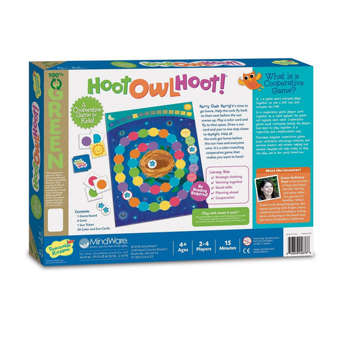Continutul jocului include: 1 plansa de joc, 6 jetoane bufnita, 1 simbol soare, 14 cartonase soare si 36 cartonase culoare. Este un joc premiat, avand distinctii precum Disney FamilyFun Toy of the Year Award si Dr. Toy 100 Best Childrens Products Award.