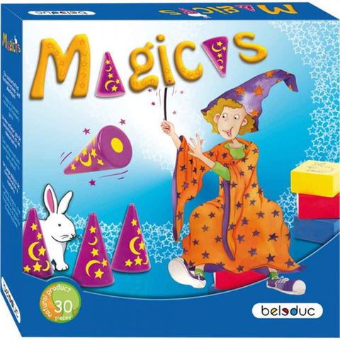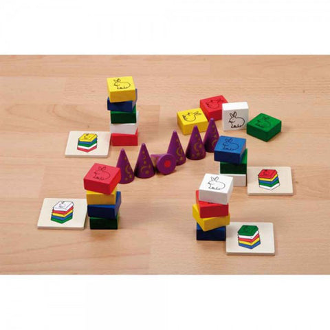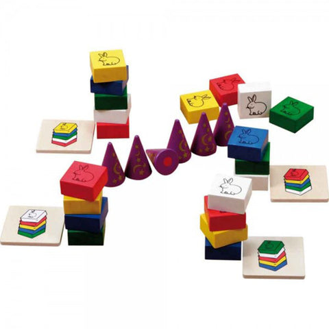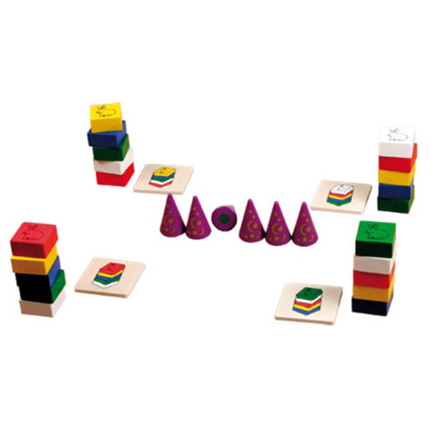- Jocul contine: 20 de caramizi din lemn colorate, 6 palariute de vrajitor si 4 carduri din lemn.