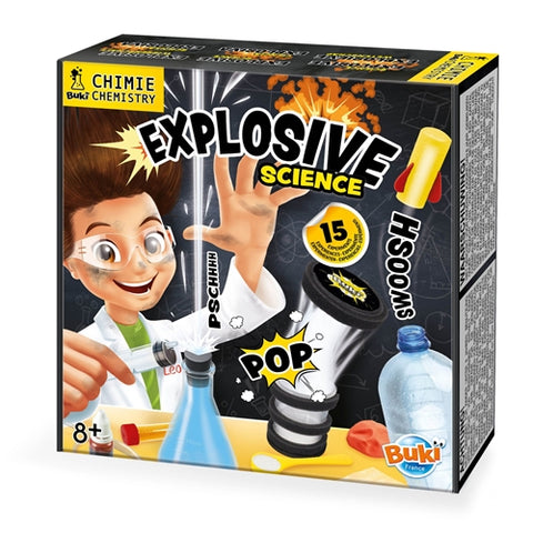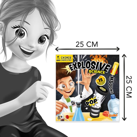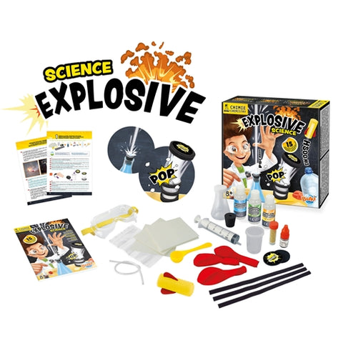 - Contine: ochelari de protectie, bicarbonat de sodiu (50g), acid citric (20g), pahar, protectii rotunde din spuma, benzi de spuma, lingura de masurat, colorant rosu, balon, dop de cauciuc, sclipici auriu, racheta, tub de plastic, seringa, filtre de hartie, baloane, punga cu fermoar, carbonat de sodiu (50g), instructiuni ilustrate.