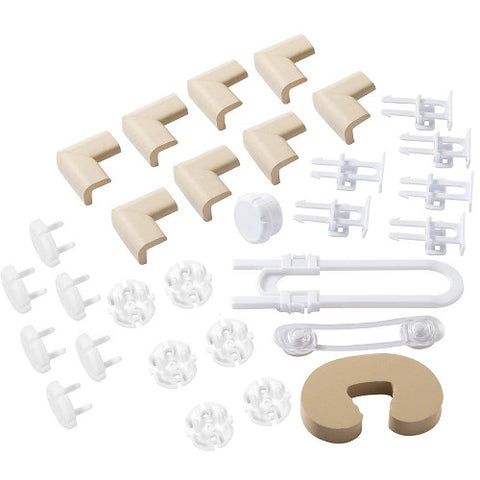 • Kitul cuprinde 12 aparatori pentru priza, 8 pernute protectoare pentru colturi care pot fi reutilizabile, 6 protectii de siguranta pentru dulap sau sertar, 1 siguranta manere dulapuri, 1 opritor pentru usa, 1 siguranta toaleta ce impiedica copilul sa deschida capacul vasului de toaleta, 1 sistem de siguranta ce se foloseste pentru a mentine suspendat excesul cordoanelor de reglare ale jaluzelelor ce pot fi la indemana copilului.