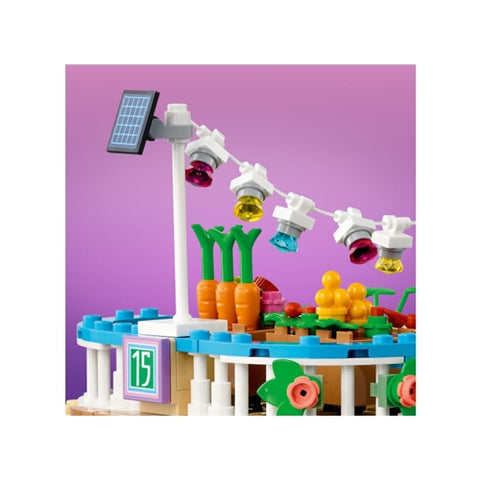 • Pe punte este o gradina cu cutii de legume si fructe, un mar si o zona de intalnire decorata cu luminite festive.
