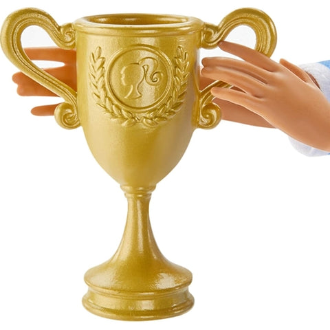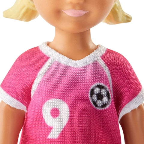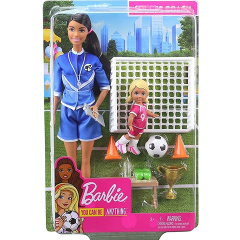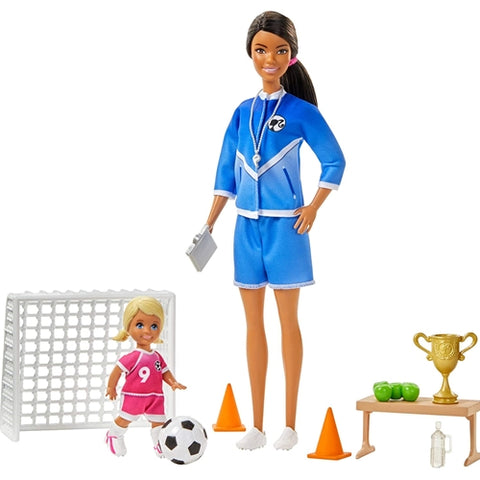 - Setul de joaca include o papusa antrenoare de fotbal Barbie bruneta, imbracata in echipament de fotbal albastru si o mica papusa eleva imbracata in echipament de fotbal roz.