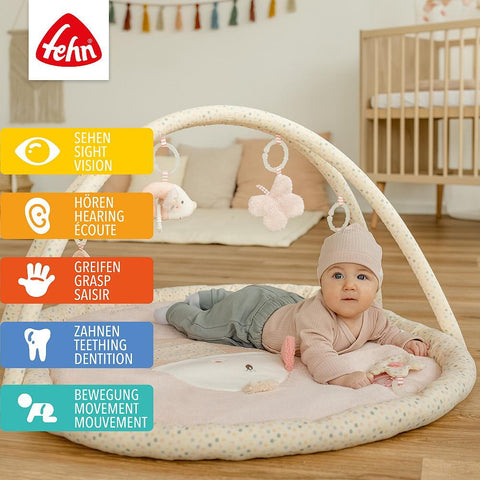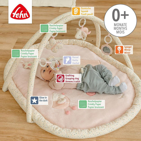 - Experienta tactila si auditiva: Fiecare element de pe salteluta ofera o experienta unica: soricelul ascunde un scartaitor, fluturele si floarea fosnesc usor, iar inelul zornaitor si oglinda adauga o dimensiune interactiva suplimentara.