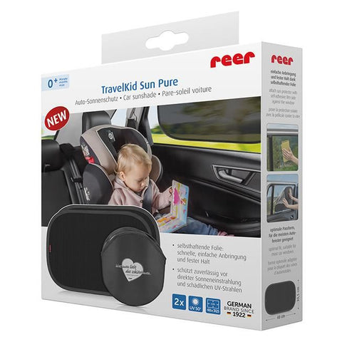 Setul de protectie solara pentru masina TravelKid Sun Pure de la Reer, alcatuit din 2 parasolare si o geanta de depozitare adecvata, iti protejeaza in mod sigur copilul de lumina solara daunatoare in masina.