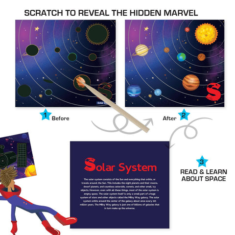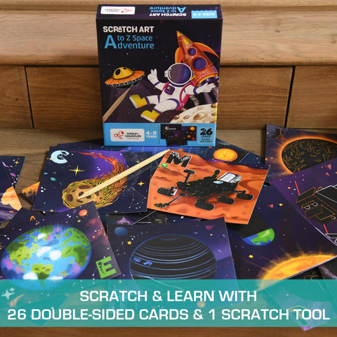 Setul creativ de razuit "Aventuri in spatiu" de la Chalk and Chuckles este perfect pentru micii artisti care doresc sa exploreze universul intr-un mod distractiv si educativ. Acest joc 2 in 1 transforma invatarea intr-o aventura captivanta, oferind 26 de cartonase cu modele fata-verso. Pe o parte, copiii pot razui pentru a descoperi imagini fascinante, iar pe cealalta parte, vor gasi informatii interesante despre sistemul solar, adaptate pentru varsta lor.
