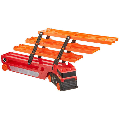 - Combinati Mega Transporter cu pista Orange Hot Wheels si trimiteti masinile la cursa pe pista traditionala de raliuri! (vandut separat).