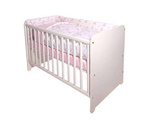 Set lenjerie de pat 60 x 120 cm, SMILE, confectionata 100% din bumbac ranforce, ofera un confort deosebit. Potrivita pentru patuturi cu dimensiuni interioare de 60 x 120 cm. Datorita rezistentei si calitatii ridicate a tesaturii si imprimarii, poate fi folosita o perioada lunga de timp fara a-si modifica culorile sau caracteristicile, in conditiile respectarii instructiunilor de utilizare si intretinere. Gama variata de culori cu diverse imprimeuri vesele, specifice varstei copilariei. Setul contine 10 piese: - Fata de pilota, 1 buc. 95 x 140 cm. - Pilota cu umplutura usoara si moale, 1 buc. 95 x 140 cm. - Fata de perna, 2 buc. 43 x 35 cm. - Pernuta cu umplutura, 1 buc. 43 x 35 cm - Cearsaf din bumbac cu elastic, 1 buc. 60/120+15 cm. - Laterale protectoare pentru conturul patului (3 buc.) din burete – husa cu fermoar si prindere cu siret. Dimensiune husa pentru laterale - 1 buc. 180 x 30 cm. Dimensiune laterala din burete - 3 buc. 60 x 30 cm. Protectiile de pat ofera siguranta, eliminandu-se astfel posibilitatea sa se loveasca copilul de gratiile patului. Toate piesele se pot utiliza pentru patuturi cu dimensiunea de 60 x 120 cm. Gama variata de culori cu diverse imprimeuri vesele, specifice varstei copilariei. Materialele din care este realizat setul de lenjerie: - bumbac ranforce 100%. - umplutura - interiorul este umplut cu un strat de poliester. Toate piese sunt lavabile la maxim 30 grade Celsius. Fabricat in UE.
