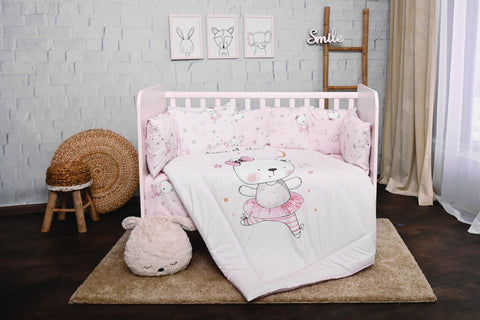 Descoperiti confortul suprem pentru bebelusul dumneavoastra cu setul de lenjerie de pat de 8 piese, realizat din bumbac ranforce de inalta calitate. Acest set nu doar ca ofera un aspect adorabil cu imprimeul Pink Ballerina Bear, dar asigura si o utilizare indelungata datorita rezistentei si durabilitatii materialului. Fiecare piesa este conceputa cu atentie pentru a oferi un mediu sigur si confortabil pentru somnul celor mici.