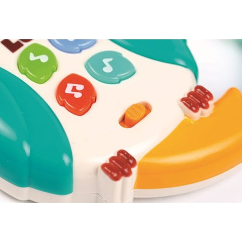 - Pe cioc, are o tastatura de pian (do, re, mi, fa), ce le permite copiilor sa compuna primele melodii.