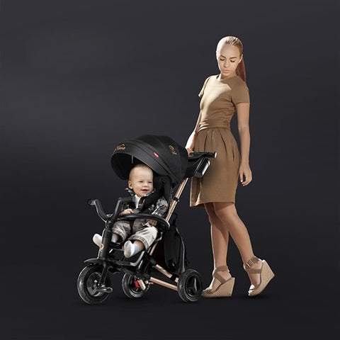 - Tricicleta Qplay Nova Gold este echipata cu roti din cauciuc plin care ofera un confort sporit pe fiecare tip de teren.