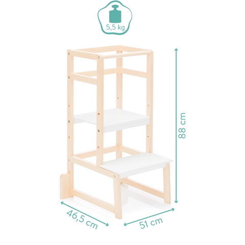 Micuta ta este deja foarte curioasa si vrea sa ajute sau sa caute peste tot? Atunci turnul de invatare Fillikid este ideal. Intrucat cei mici cresc rapid, inaltimea suportului poate fi ajustata perfect la marimea actuala a copilului. Nu numai ca este frumos la privit si se potriveste perfect in orice mediu de locuit prin designul sau modern, dar simplu, dar este si extrem de stabil si ofera o protectie excelenta impotriva rasturnarii prin suporturile laterale si constructia solida. Cand este folosit in bucatarie, copilul dumneavoastra poate observa fara efort procesele de gatit si, de asemenea, poate participa la distractia din bucatarie. Gatitul impreuna este simplificat cu Learningtower, deoarece aveti mainile libere. Si pentru ca micutii nostri cresc atat de repede, poti regla perfect inaltimea suportului cu 3 cai reglabile pe inaltime (40 / 50 / 60 cm) la inaltimea actuala a copilului. Odata stapanit drumul spre varf, bara rotunda serveste pentru a se tine si, bineinteles, ca protectie impotriva caderii. Turnul de catarare este potrivit de la varsta de 12 luni. Jocul si invatarea la nivelul ochilor cu parintii sau fratii mai mari il ajuta pe copil sa experimenteze interactiunile sociale foarte rapid si ii promoveaza abilitatile, de asemenea ajuta la intarirea legaturilor cu ceilalti. Turnul de invatare este realizat 100% din lemn de esenta tare european in UE. Desigur, se folosesc doar lacuri fabricate si certificate in Germania.